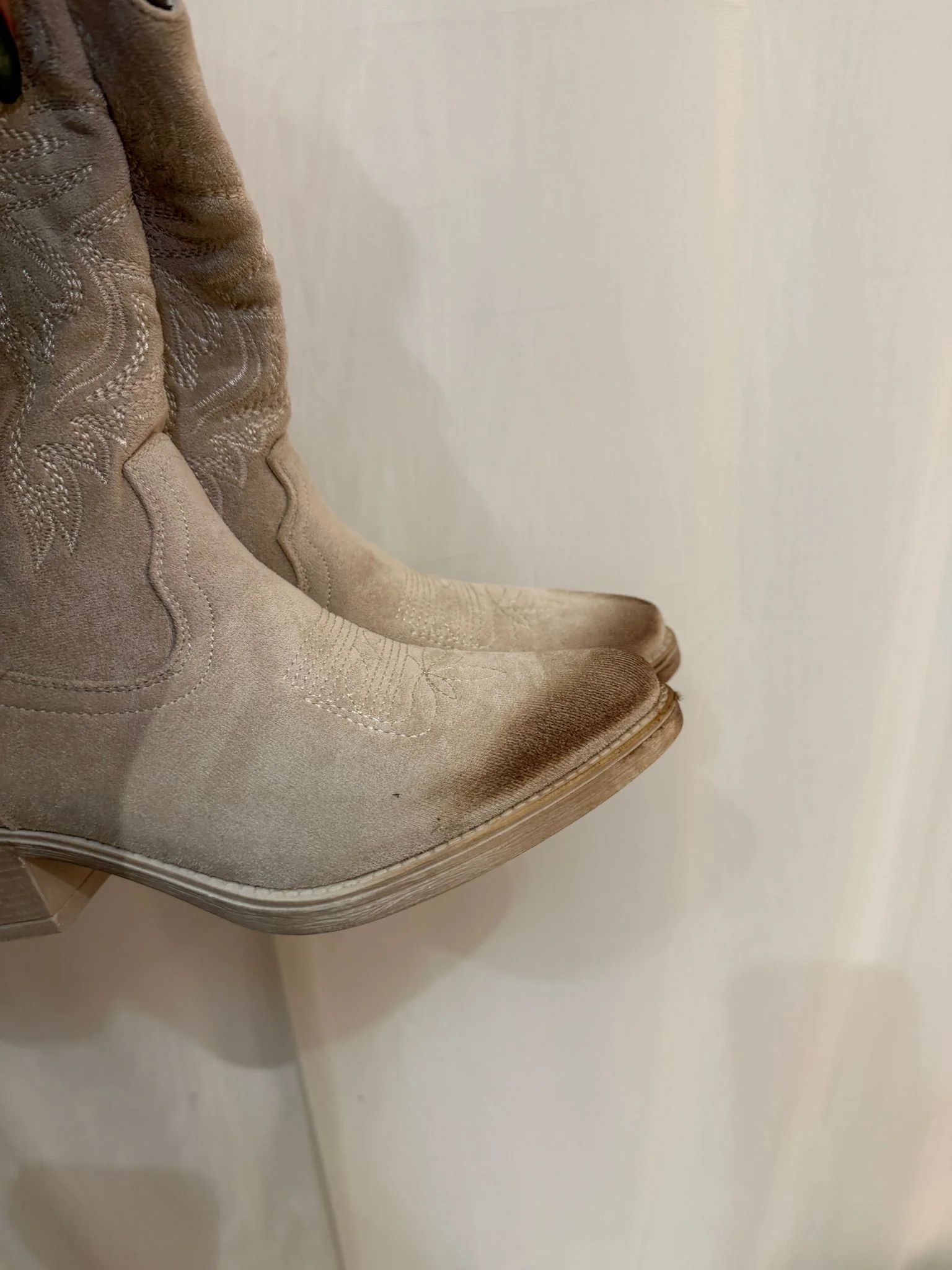 A plush cream classic cowboy boot. Light-weight and perfect for Spring & Summer. A comfy low heel & zip for easy fitting. With a rustic grazed toe & heel area.